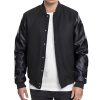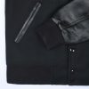 Our varsity jacket features genuine leather sleeves that add a touch of sophistication and durability. The body of the jacket is made from high-quality acrylic cotton, ensuring comfort and warmth. The solid black color offers a sleek and versatile look, making it easy to pair with any outfit. With a band collar style and robust varsity snaps/buttons, this jacket provides a secure fit and a timeless silhouette.